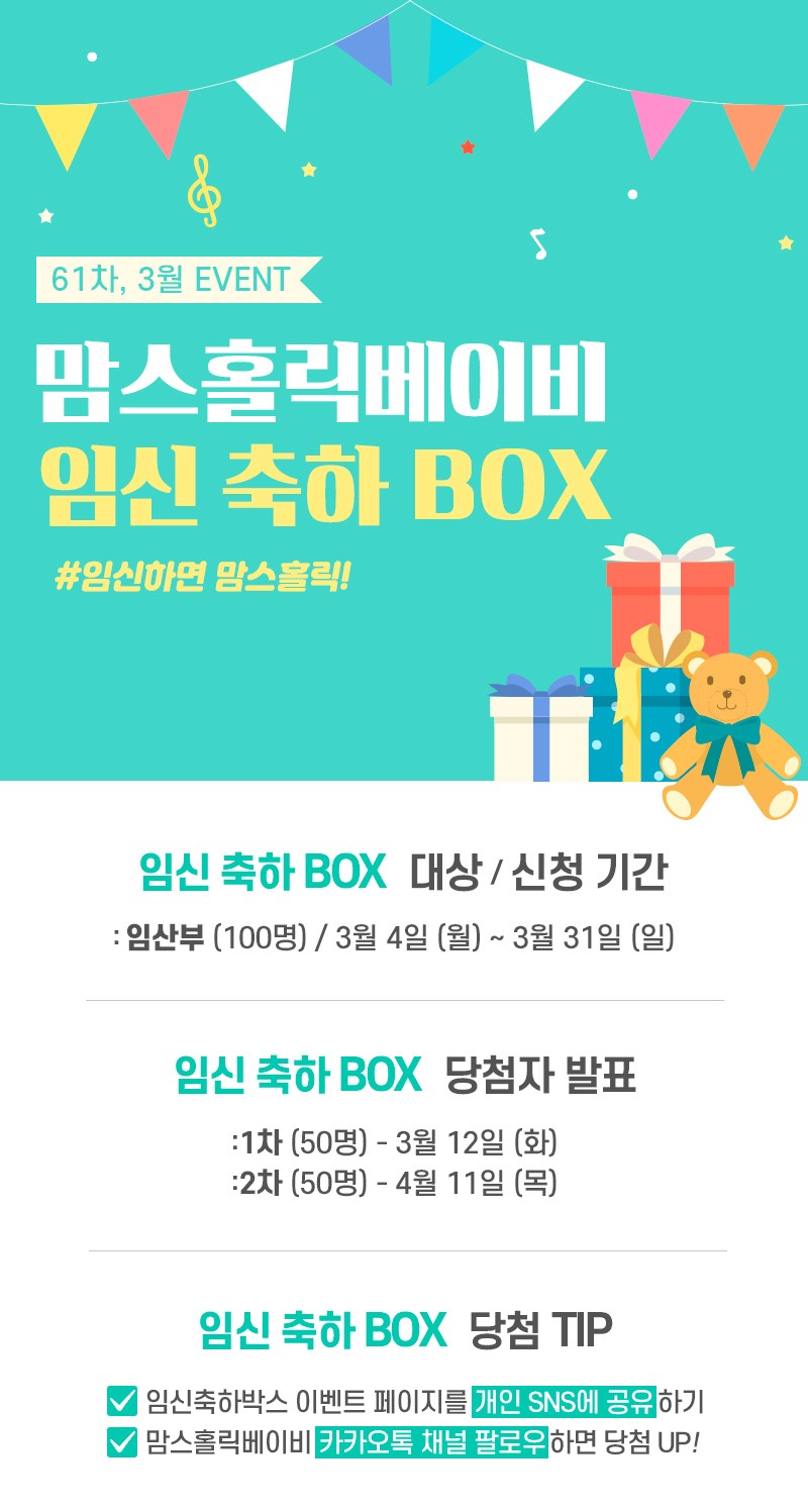 - 1차 발표 : 3월 12일(화) (임신축하박스 50명 + 물티슈 1박스 5명)